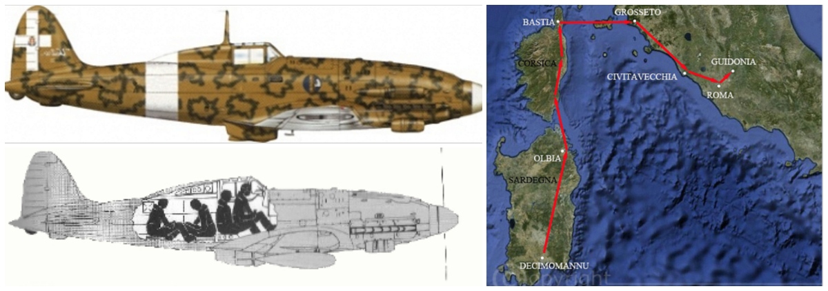 A sx spaccato esempio della posizione degli uomini nel Macchi. A dx il volo direzione: Olbia, Bastia, Grosseto, Civitavecchia, Roma, Guidonia. (Fonte: decimomannuairbase.com)