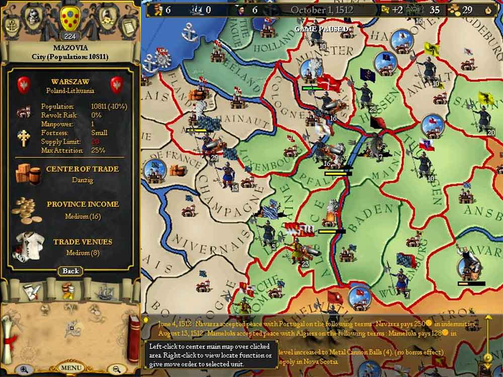 29 Ottobre. La Persia dichiara guerra all’Impero Mughal. La Turchia, nella guerra contro i Mammalucchi, ha preso il controllo di Aleppo e Siria. Un matrimonio di stato e’ accordato dalla Grecia, mentre Venezia, sola, rifiuta di entrare nella nostra alleanza. Intanto Genova si e’ alleata con Spagna e Kleves. questo potrebbe rallentare i nostri piani, ma allo stesso tempo posso sperare che Genova venga annessa dalla Francia per poi prendere i territori conquistati.