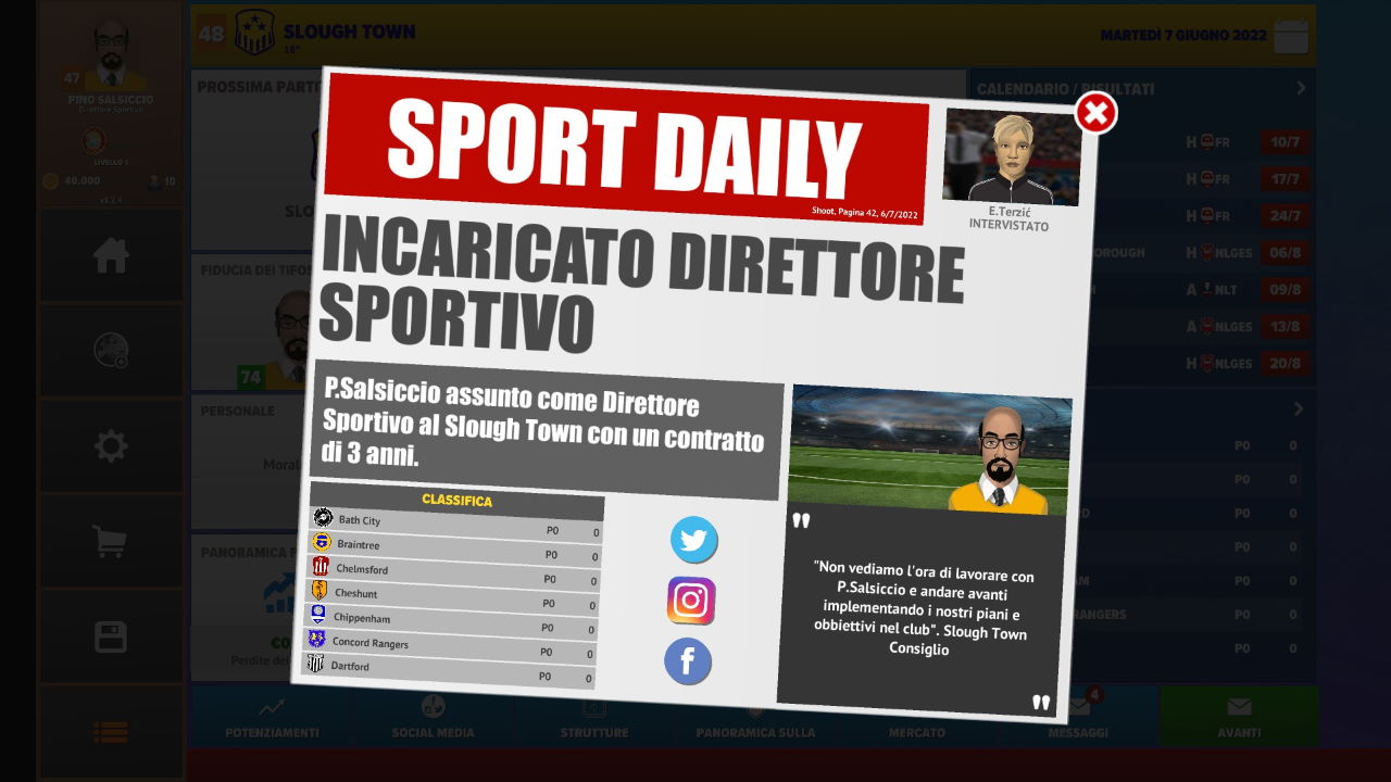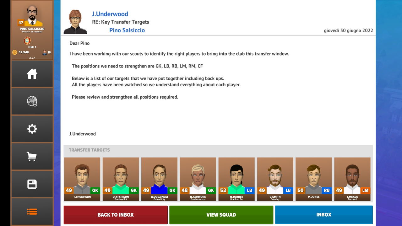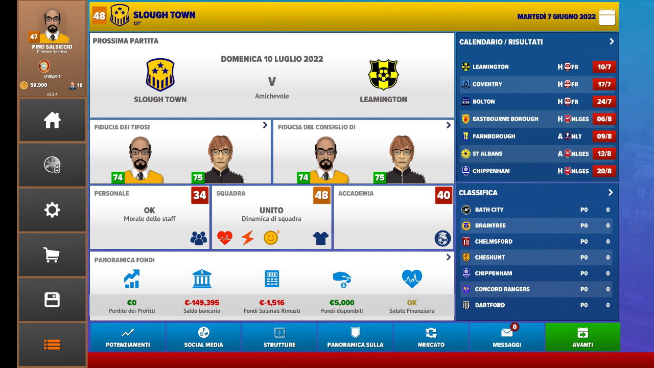Il gioco ha una premessa interessantissima: ci mette infatti nel ruolo del direttore sportivo, e non dell’allenatore. Questo significa che non avremo modo di controllare direttamente la selezione dei giocatori per la partita se non scavalcando l’allenatore (cosa che giustamente lo farà infuriare, con le risultanti conseguenze), o scegliere l’allenamento o gestire direttamente le finanze. Dovremo soprattutto operare sul mercato, fare scelte pubblicitarie, gestire le infrastrutture del club e parlare con la stampa.