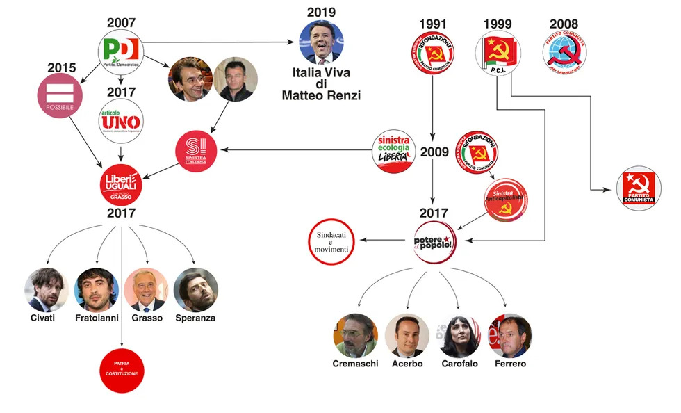 In una decade il partito di riferimento della sinistra italiana ha visto al suo interno il verificarsi di dieci scissioni, sintomo evidente della mancanza di un dialogo prolifico e della presenza di interessi fra loro divergenti, magari non a causa della visione politica ma in relazione alla spartizione del potere all’interno del partito stesso, come nel caso di Roberto Speranza con Articolo Uno.