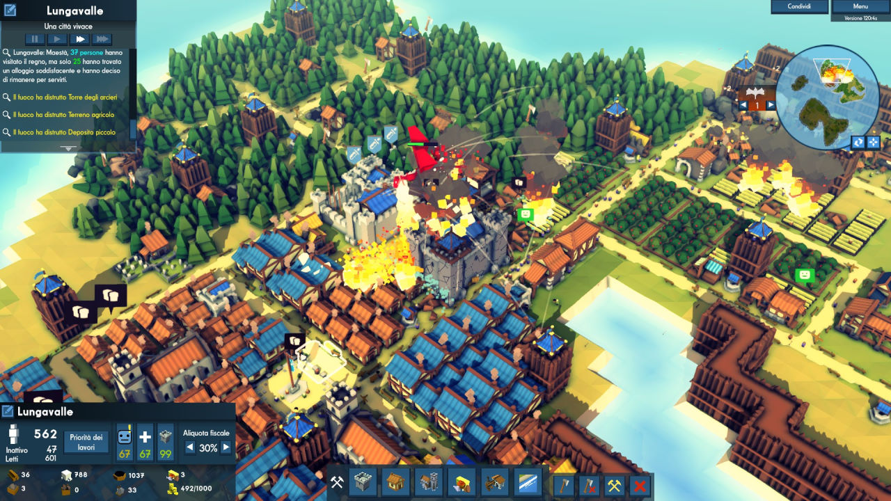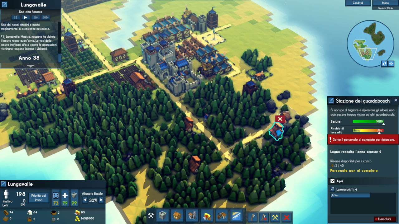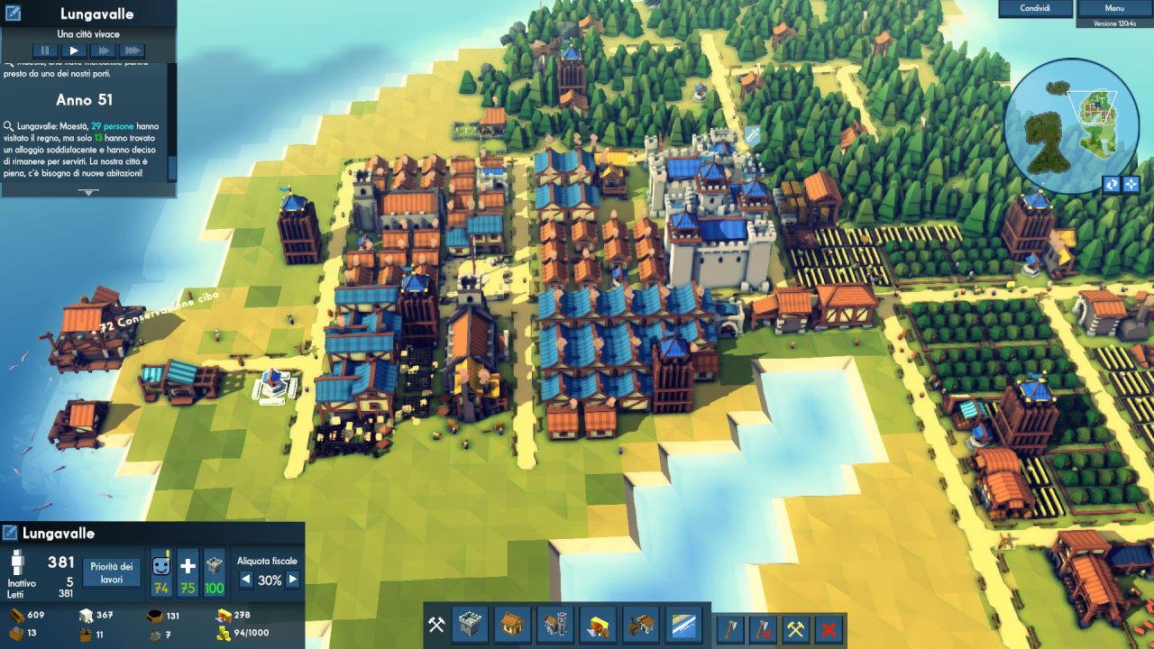 Per far prosperare il nostro villaggio potremo attingere alle risorse naturali presenti sull’isola dove fonderemo il nostro castello; ritroveremo la relazione tipica di questi giochi tra i posti letto disponibili, i lavori da effettuare, il cibo da produrre, la felicità e la salute da mantenere sopra il livello di guardia. Tutto è gestito senza scendere troppo nel dettaglio, cosa che aiuta a mantenere fluido e veloce il gameplay (anche al costo di sacrificare qualcosa a livello di profondità).