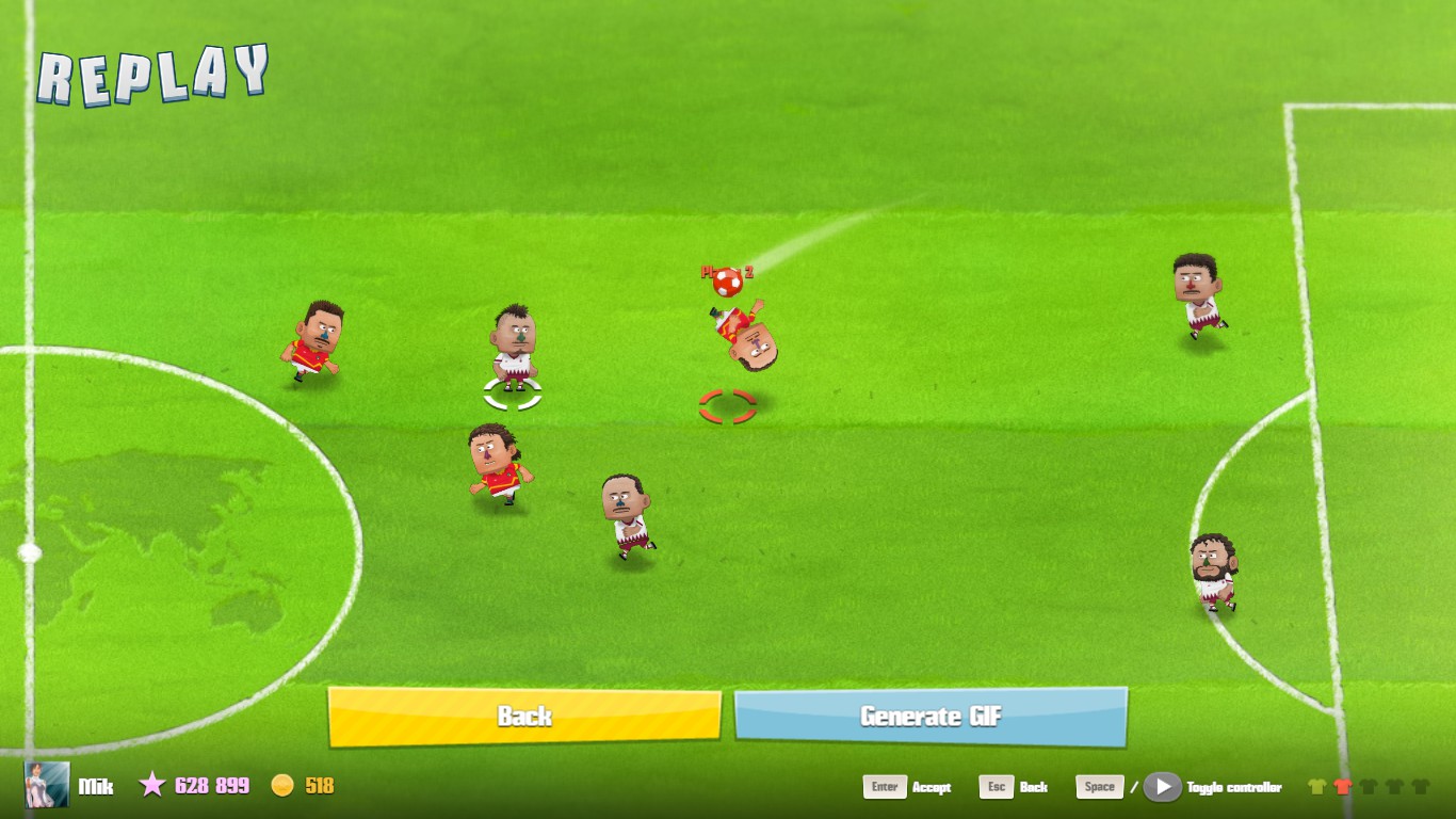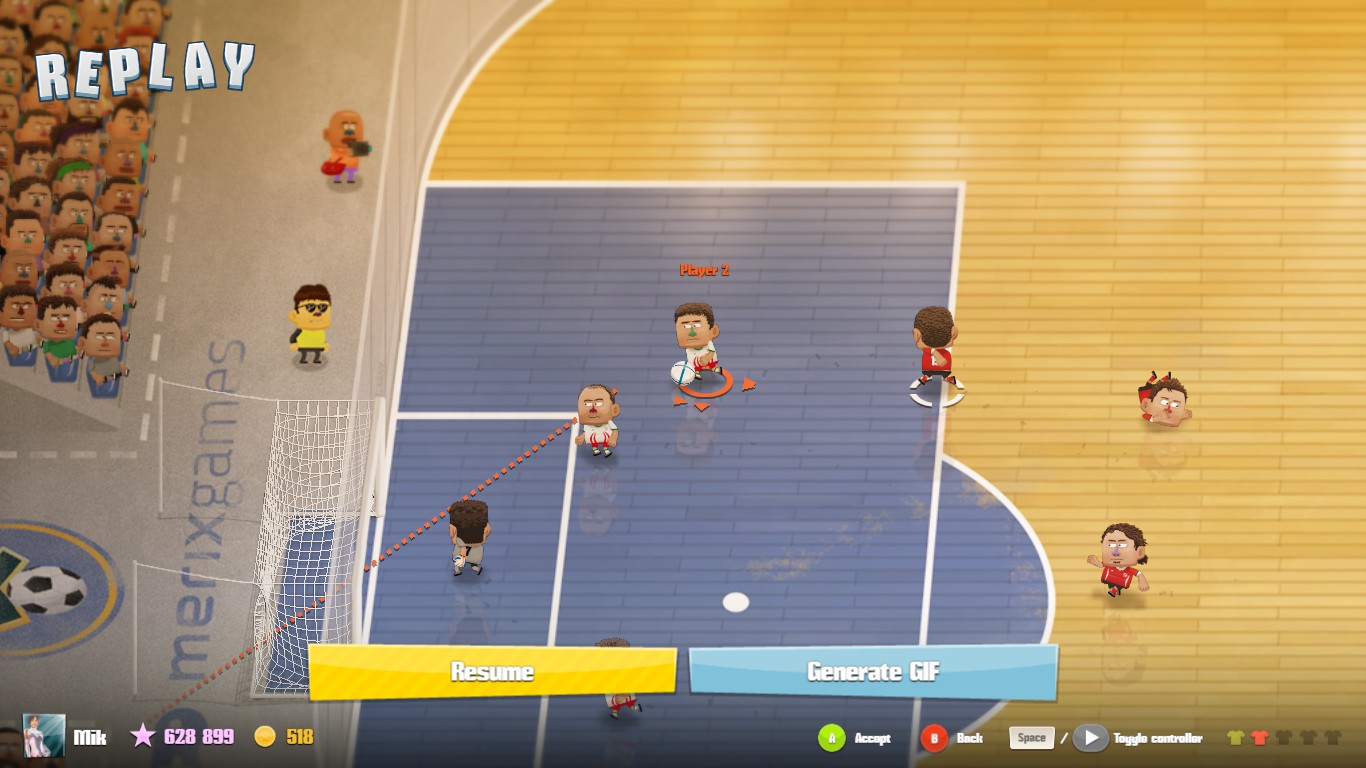 I controlli sono infatti semplici e piuttosto fluidi, ma questo non impedisce di avere dinamiche divertenti ed anche abbastanza complesse. L’accento è in particolare sul sistema di tiro, con un caricamento in stile bullet time e la possibilità di imprimere un certo effetto al pallone, e sul recupero palla, che può avvenire tramite tackle mai puniti dall’arbitro o con un’abile manovra difensiva, più difficile da effettuare ma che permette di ripartire palla al piede più velocemente. Notevole anche il sistema di scatto, che funziona solo se il giocatore non ha la palla incollata al piede, ricordando per certi versi i lavori di Dino Dini. A completare il quadro ci sono colpi al volo, passaggi lunghi e corti e scivolate del portiere, che gode di una semi invulnerabilità ai contrasti di gioco.