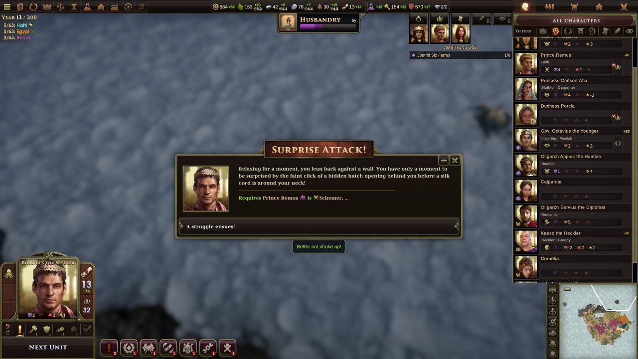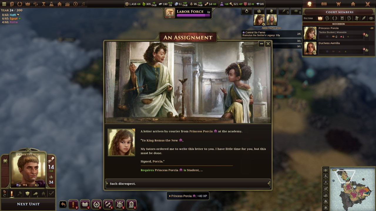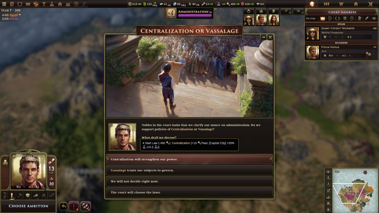 Grazie a questo accordo, ed alla centralizzazione dell’amministrazione, il nostro impero comincia a respirare ed i benefici per i nostri cittadini sono immediati; Romolo è amato dal popolo, mentre il fratello Remo mastica amaro. Nonostante i nostri tentativi di riavvicinamento, fra i due continua a scorrere cattivo sangue.