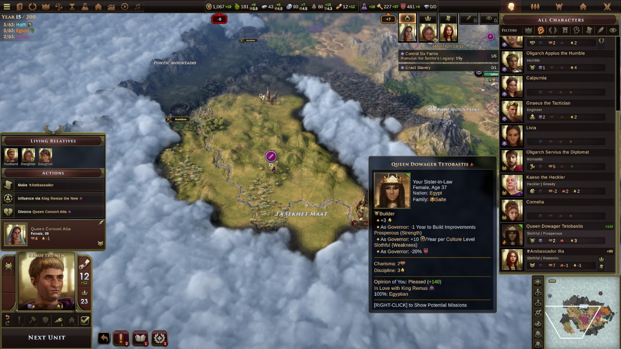Mentre i nostri scout a nord hanno i primi contatti con gli ittiti, altro impero principale, e con i vandali, coi quali stringiamo qualche piccolo accordo commerciale, l’amicizia con l’Egitto cresce; tanto che dopo pochi anni viene organizzato un matrimonio ufficiale fra Romolo e Tetobastis, avvenente esponente della famiglia reale egiziana.