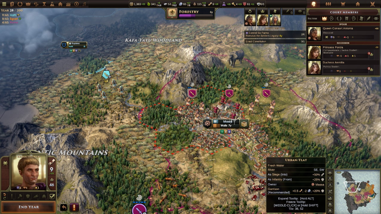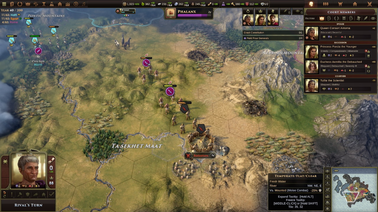 Dobbiamo assolutamente contenere l’espansione ittita, quindi dichiariamo guerra ai numidi per prenderci i loro insediamenti prima che lo faccia l’impero rivale, e lo stesso facciamo nei confronti delle tribù barbare che circondano il territorio romano da sud-ovest a sud-est. Intanto intorno a Remo i suoi familiari si ammalano e muoiono a ripetizione; prima è il turno di Tetobastis, la moglie di Romolo con cui si intratteneva, poi arriva il momento della moglie Antonia ed inaspettatamente entrambe le eredi, Porzia ed Emilia.