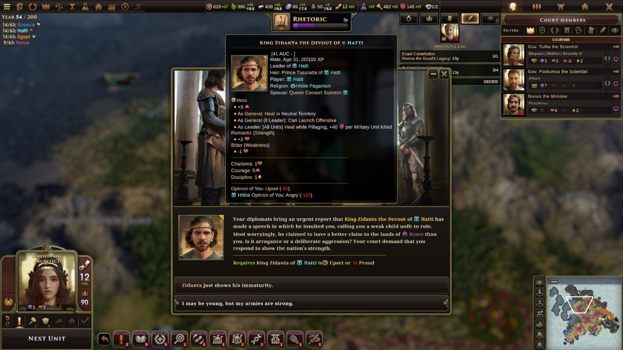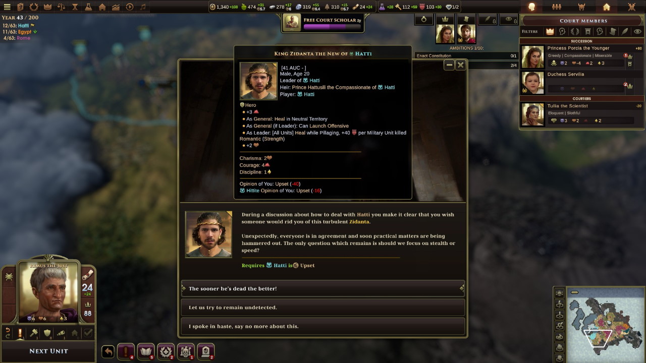 Mentre i traci ci chiedono aiuto per la loro guerra contro la Scizia, gli ittiti proclamano un nuovo re: Mursili, un uomo mite ma che potrebbe metterci in difficoltà. Intanto a corte arriva un dignitario egiziano, Cimone. Costui è vicino alla linea dinastica attualmente in carica, ma ci crea non pochi problemi con la sua condotta dissoluta, e ben presto la sua presenza diventa ingombrante: la popolazione vuole la sua testa per un omicidio dovuto a fatti di donne, ma Remo, per mantenere un equilibrio, si limita ad esiliarlo… scontentando tutti: Cimone, che pretendeva protezione, gli egiziani ed il popolo romano.