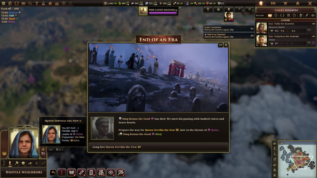 Servilia cresce, e nel corso degli anni la ragazza apprende il mestiere di regnante. Se il dissenso rimane vivo, con nuove ribellioni di schiavi che non accennano a terminare, si cerca di avvicinare alle nostre posizioni i greci, coi quali presto si organizza uno scambio di materiali pregiati.