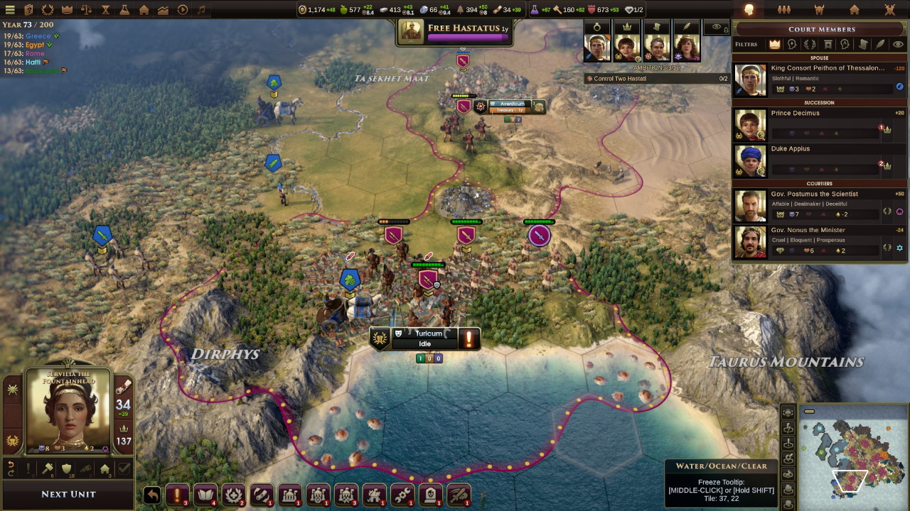 A sud catturiamo gli insediamenti vandali e li trasformiamo in moderne cittadine, mentre greci ed egiziani dichiarano guerra ai traci, l’unica tribù con la quale siamo in pace, ed i babilonesi attaccano gli scizi.