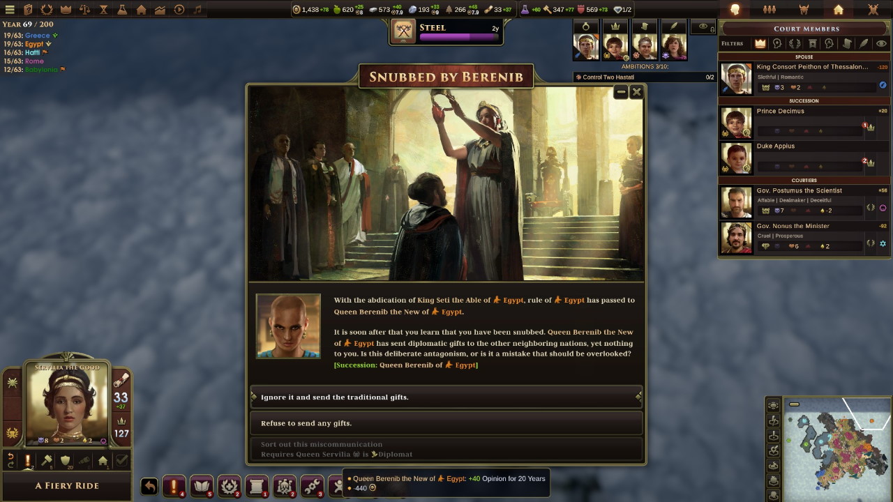 È un momento di cambi al vertice degli imperi confinanti. Seti abdica in Egitto, sostituito dalla regina Benerib, una donna dallo sguardo folle con la quale si genera un immediato incidente diplomatico: è evidente la sua voglia di creare tensioni fra le nostre nazioni nonostante i nostri sforzi di mantenere la pace. Se queste sono le premesse, tanto vale blandirla con l’invio di schiavi… malati: la città di Zau subirà la malattia trasmessa dal nostro “regalo”.