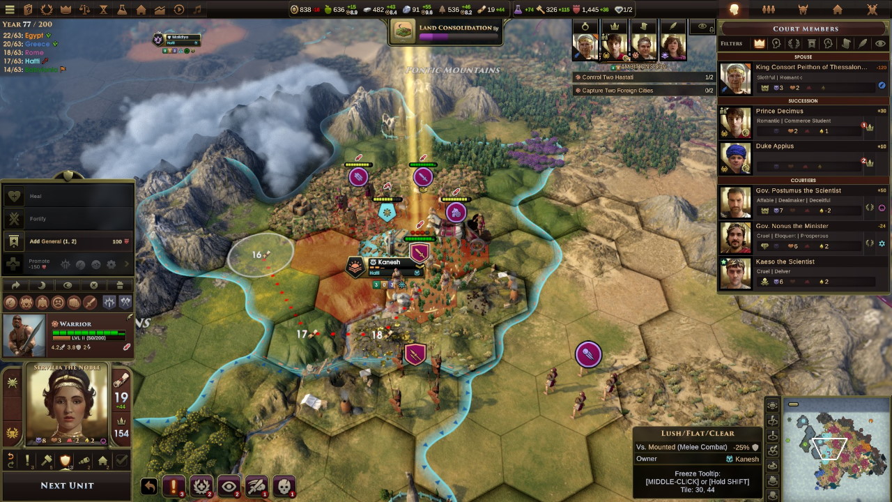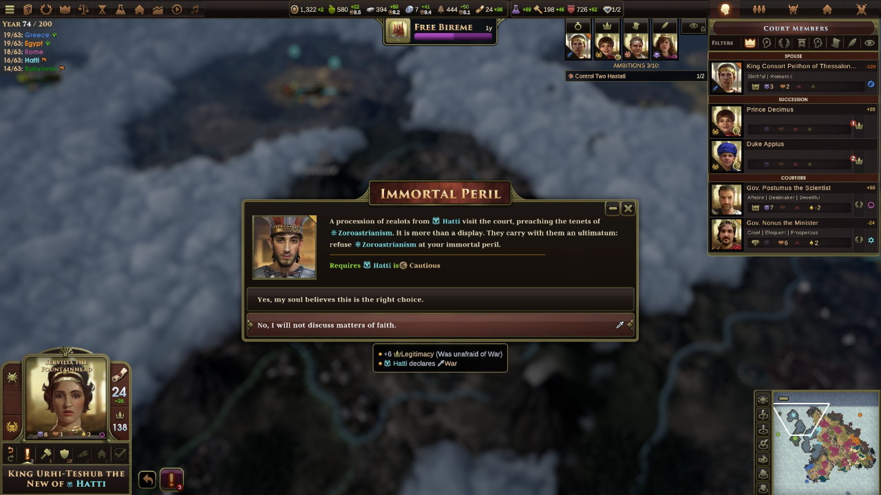 Urhi-Teshub ci mette in un angolo: una sua delegazione ci chiede di abbracciare lo zoroastrismo come religione di stato, ma Roma non vuole essere legata ad una religione particolare. Servilia tiene il punto, e in men che non si dica si giunge alle armi: è guerra!