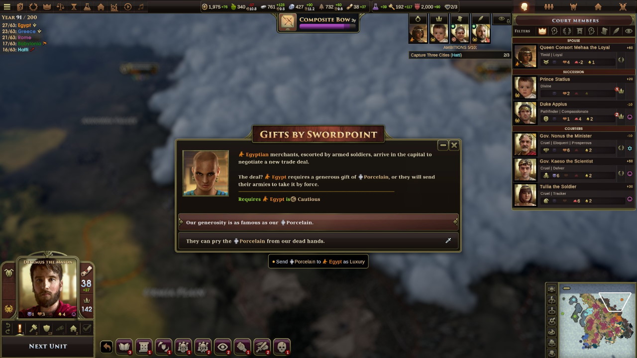 La follia della regina Benerib si mostra nuovamente quando ci chiede di donarle delle pregiate porcellane o ci dichiarerà guerra; la scelta è ovvia, visto che non siamo pronti ad affrontare una guerra su due fronti e l’esercito egiziano ad est sembra essere massiccio. Ed a dimostrare lo spirito violento di Benerib le truppe egizie entrano nel nostro territorio ma lasciano indisturbati i nostri insediamenti, procedendo indisturbate nell’entroterra ittita ed attaccando le città interne, più sguarnite; per una volta non siamo noi a doverci preoccupare su ogni lato.