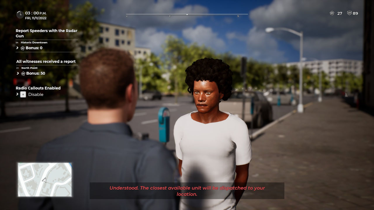 C’è poi qualcos’altro che avrebbe necessitato di maggior attenzione. Police Simulator: Patrol Officers vuole essere appunto più un simulatore che un titolo d’azione, quindi è comprensibile che ci siano momenti di vuoto durante i turni di lavoro (dalla durata variabile e che possiamo comunque modificare). S nota però una certa lentezza generale del gameplay, con attività che non sempre entusiasmano e tengono alta l’attenzione del giocatore (anche se bisogna ammettere che in città gli accadimenti sono continui).