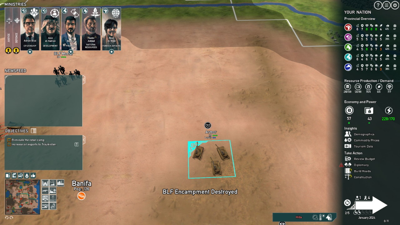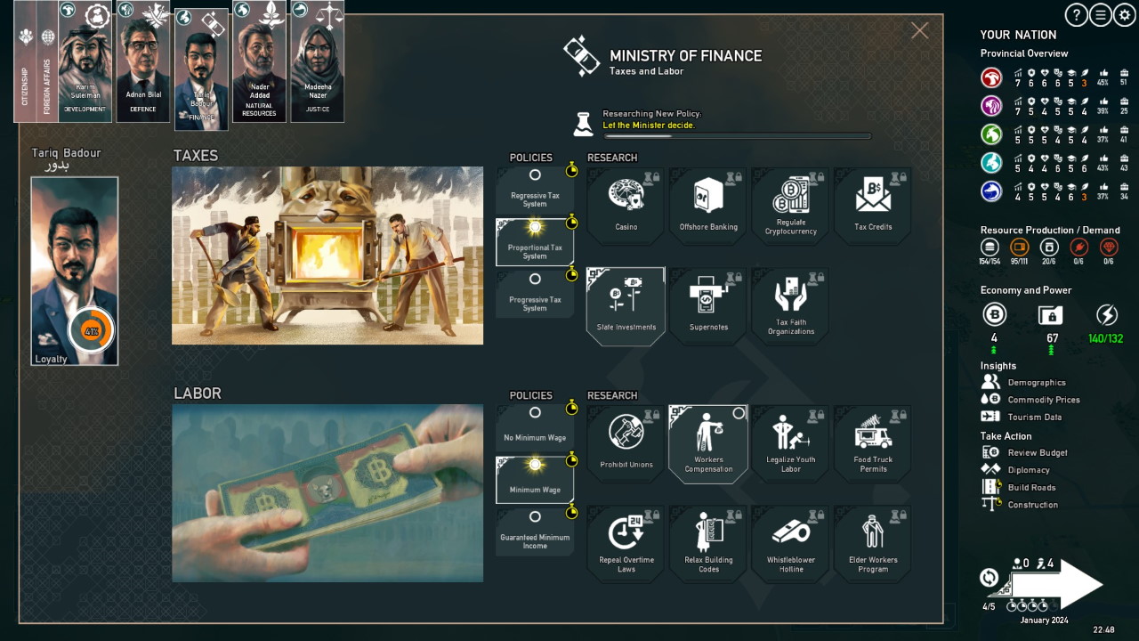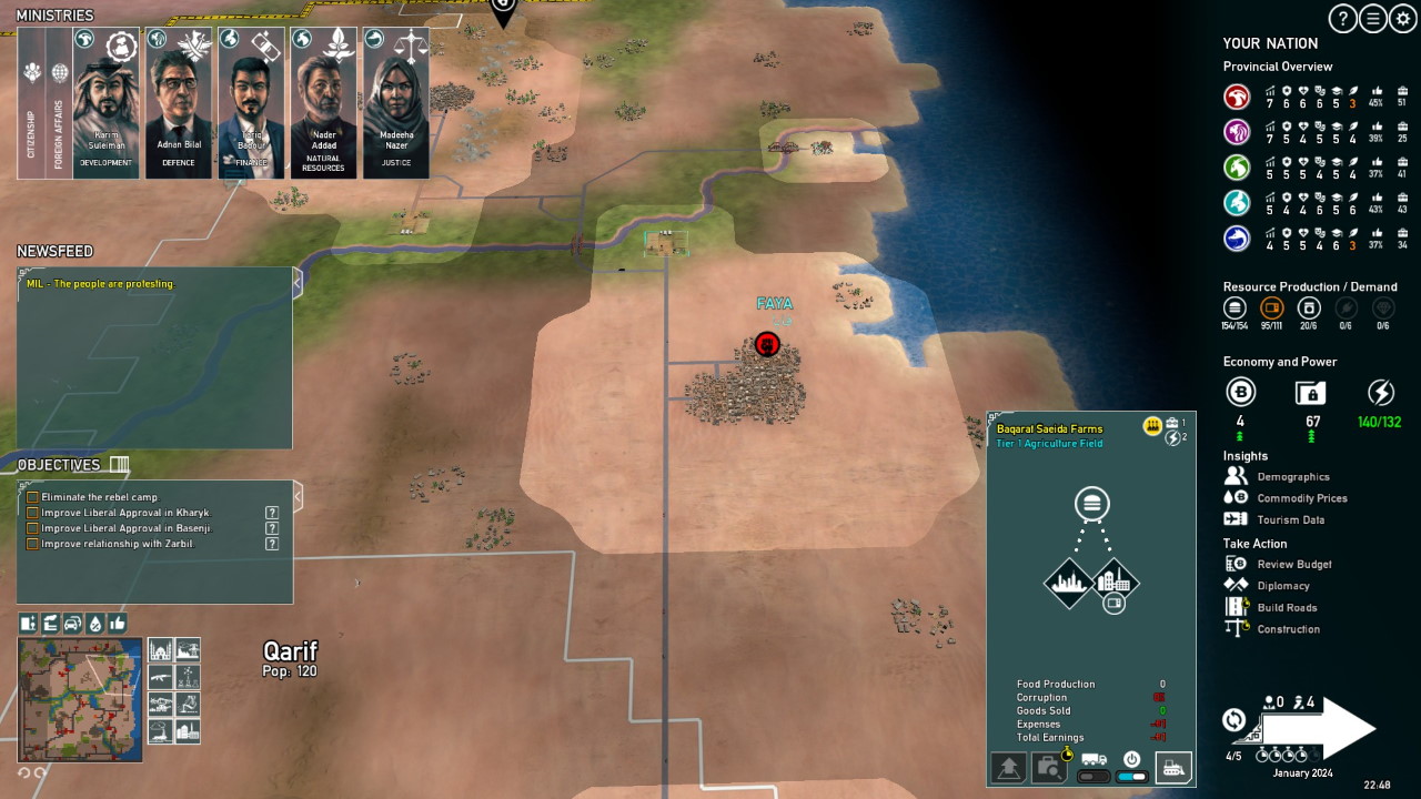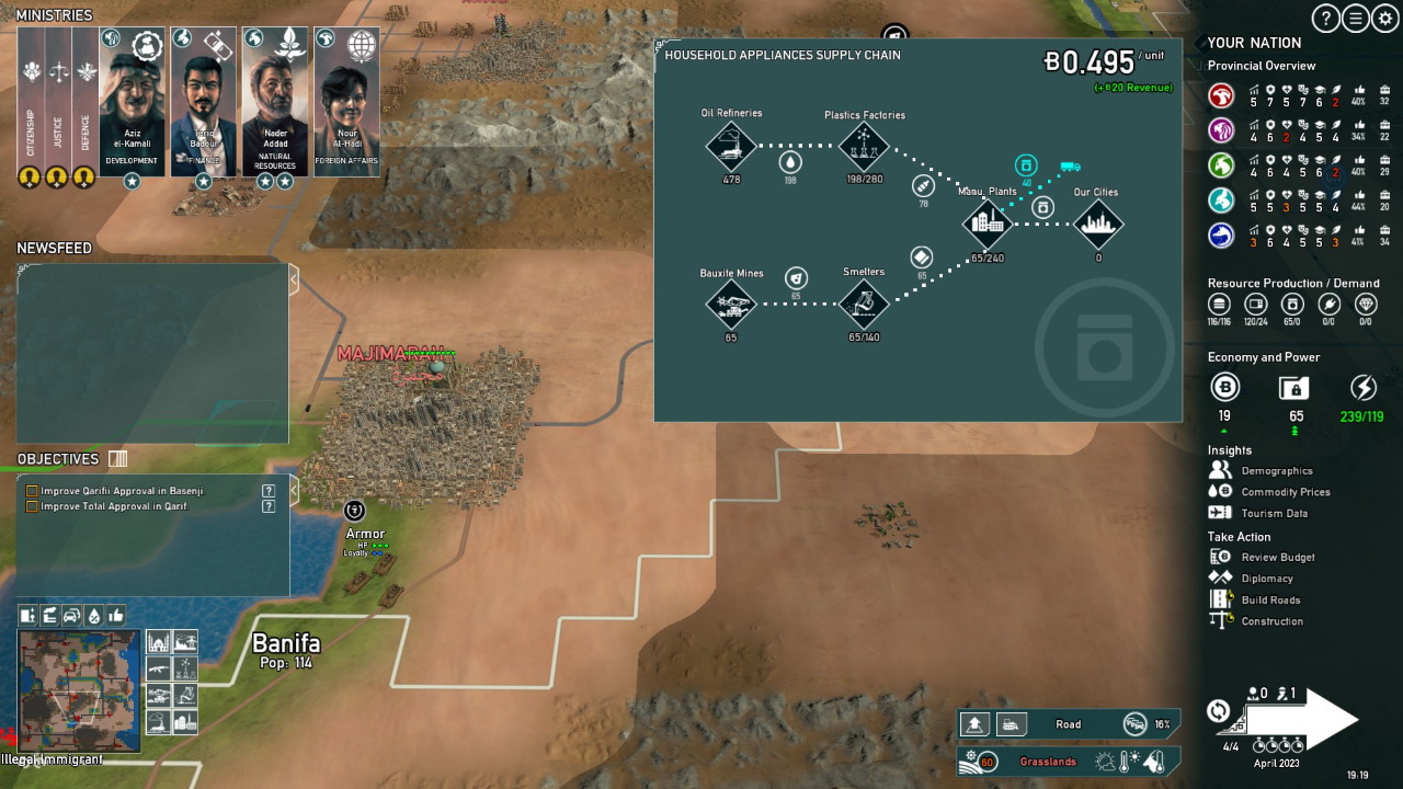 Fin da subito appare chiaro che c’è una mole di dati da analizzare non indifferente; ogni decisione può avere molteplici conseguenze, e servono necessariamente diverse ore di gioco prima di cominciare a comprendere e tenere a mente le varie implicazioni delle nostre scelte – non esito a dire che l’intera prima partita sia un lungo tutorial. Non ci aiutano fino in fondo gli strumenti di valutazione forniti dal gioco: spesso le informazioni sono distribuite su più schermate, e per darci una precisa idea della situazione dobbiamo passare dall’una all’altra mettendo poi insieme i dati nella nostra testa. Un esempio è quello della produzione nazionale, che non ha una schermata dedicata ma una serie di schermate che mostrano la distribuzione dei beni prodotti; qualcosa di scomodo e che poteva essere pensato in modo differente.