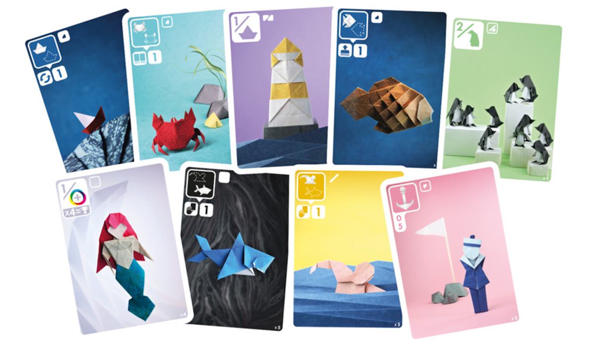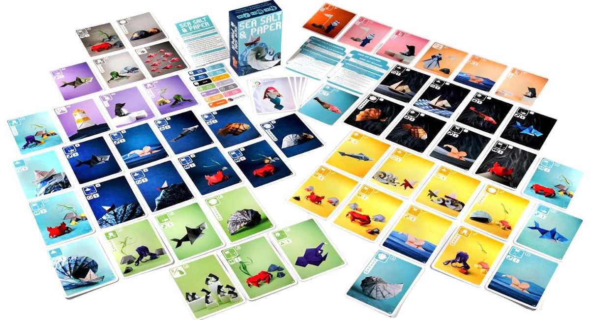 Creato da Bruno Cathala e Théo Rivière, con le illustrazioni incantevoli di Lucien Derainne e Pierre-Yves Gallard, Sea Salt & Paper è pubblicato in Francia da Bombyx e distribuito in Italia da Cranio Creations. Già al primo sguardo, il gioco colpisce per le illustrazioni. Ogni carta è una piccola opera d’arte, con origami marini realizzati con una cura rara nel panorama dei giochi da tavolo. Nessuna raffigurazione è uguale all’altra, e il colpo d’occhio che restituisce il mazzo sul tavolo è davvero notevole: tra squali, barche, granchi e pesci, ci si ritrova immersi in un’atmosfera poetica, elegante e al tempo stesso vivace. È senza dubbio questo il primo vero punto di forza del gioco, e già solo per questo vale la pena di provarlo.