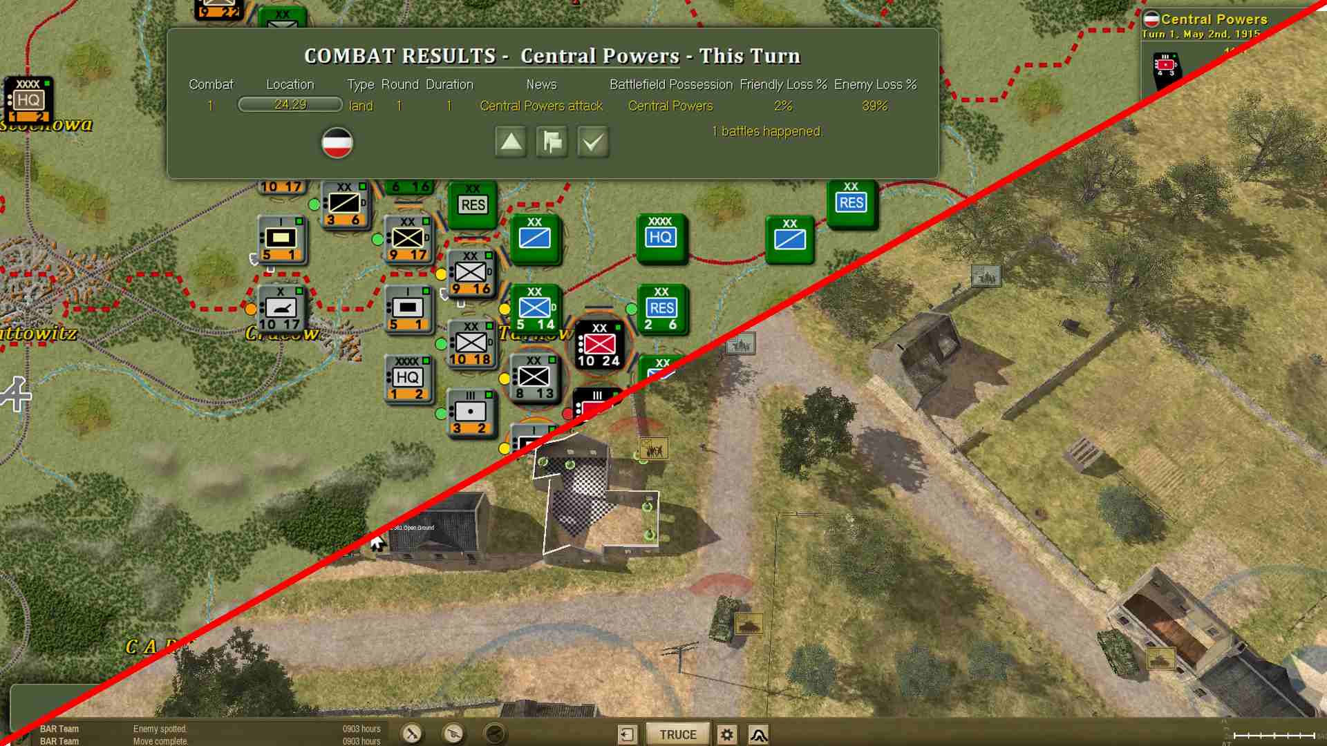 Va detto però che gli sviluppatori dei giochi a turni – sempre più profondi e sofisticati – non sono rimasti con le mani in mano ed hanno cercato di superare le restrizioni del sistema con vari accorgimenti. Le tattiche basate sullo sfruttamento di un numero fisso di turni nello scenario sono state neutralizzate con l’introduzione di meccanismi di prolungamento aleatorio della partita (addio ai furiosi assalti del penultimo turno…). La relativa passività di uno dei due giocatori durante lo svolgimento del turno avversario è in parte ovviata dall’ “opportunity fire”, una reazione automatica di fuoco da parte delle unità del giocatore passivo che scatta non appena si verifichino certe condizioni (spesso parametrabili manualmente, come nel caso di West Front, dotato di una sofisticata e flessibile gestione del fuoco di reazione). Ulteriori meccanismi di fluidificazione delle rigidità dei turni possono essere ravvisati nella possibilità di mettere certe unità in schieramento di “riserva”, in modo tale che durante il turno avversario possano muovere autonomamente ed ingaggiare un’unità nemica venuta a trovarsi nel loro raggio d’azione (le “local reserves” e le “tactical reserves” di Operational Art of War). In alcuni casi è stato ripreso da alcuni giochi da tavolo il sistema dell’iniziativa variabile, un meccanismo che in presenza di certe condizioni sottrae un turno ad un giocatore (in genere per via della sua scarsa propensione all’azione) per assegnarne due consecutivi all’avversario (ancora Operational Art of War). Lo scorrere del tempo ed il suo assorbimento per operazioni impegnative viene simulato con sistemi astratti, che decurtano il potenziale di azione delle unità – comprese quelle che non hanno mosso – in relazione al “time expended” per azioni già svolte (sempre Operational Art of War): va detto che spesso questi sistemi non sono sempre molto intuitivi e rappresentano una difficoltà considerevole nell’apprendimento del sistema di gioco.
