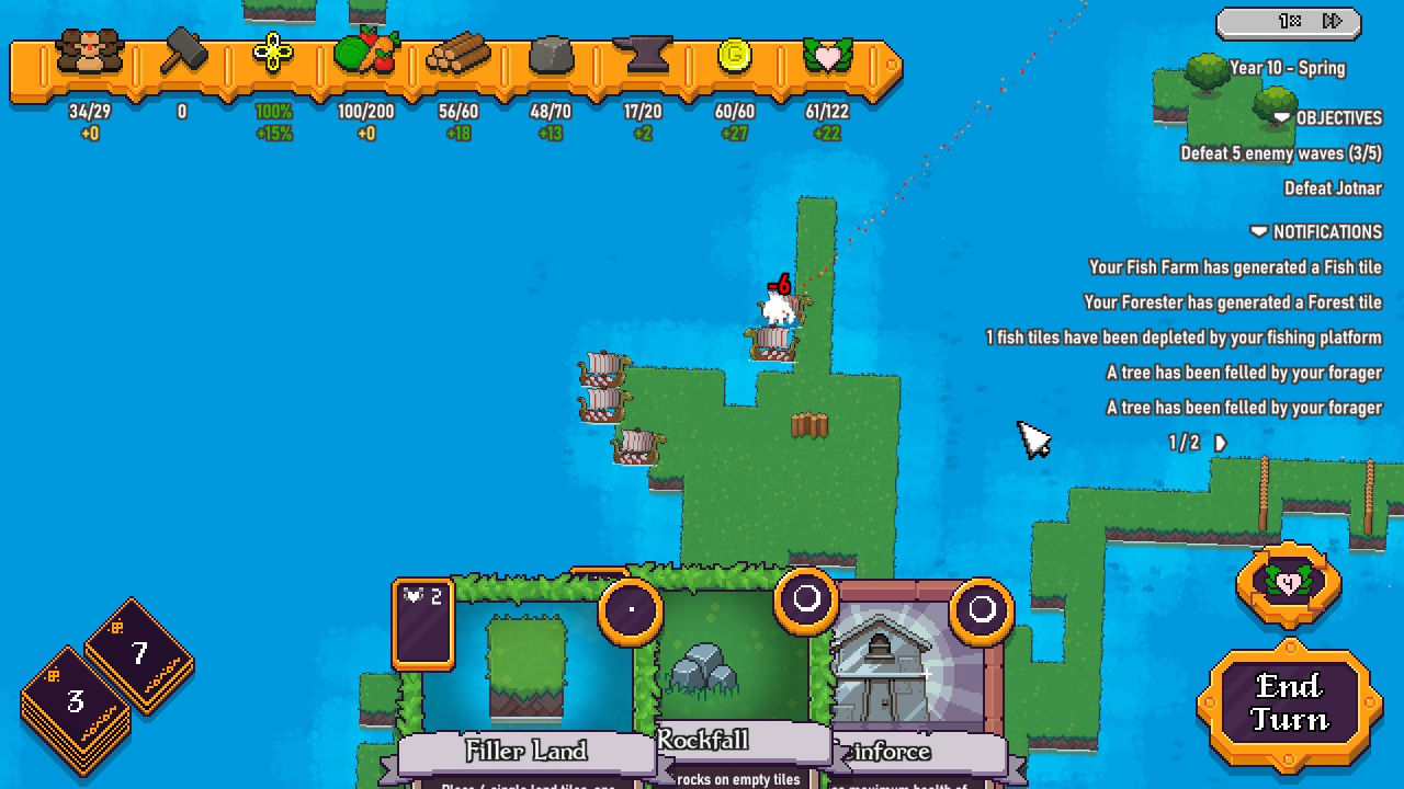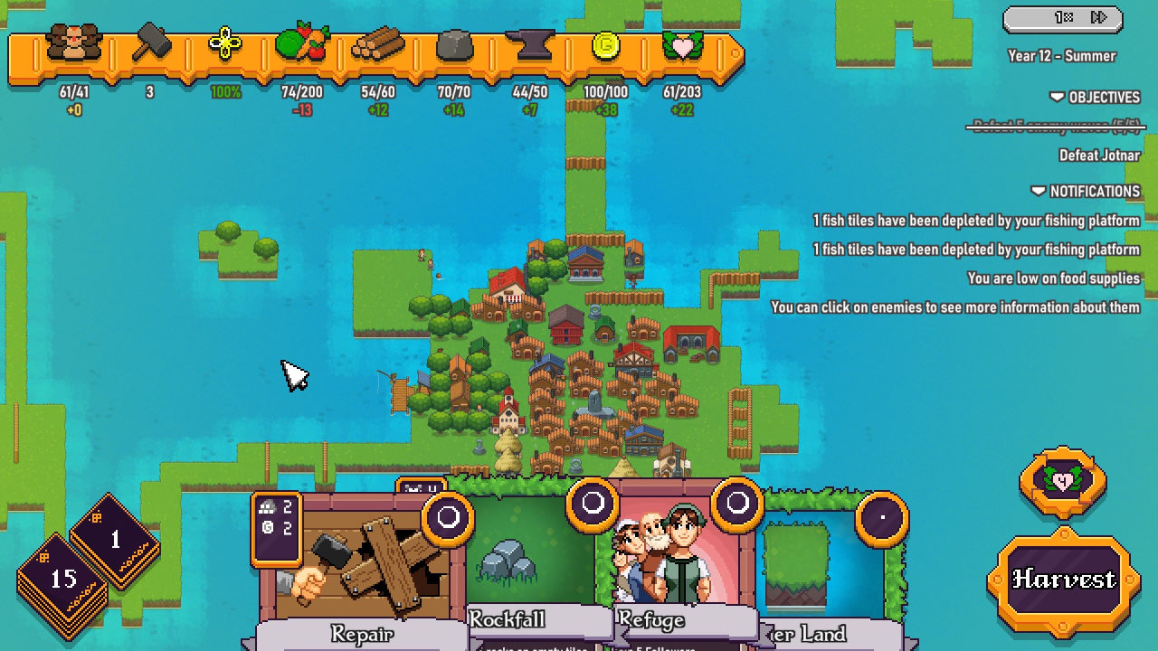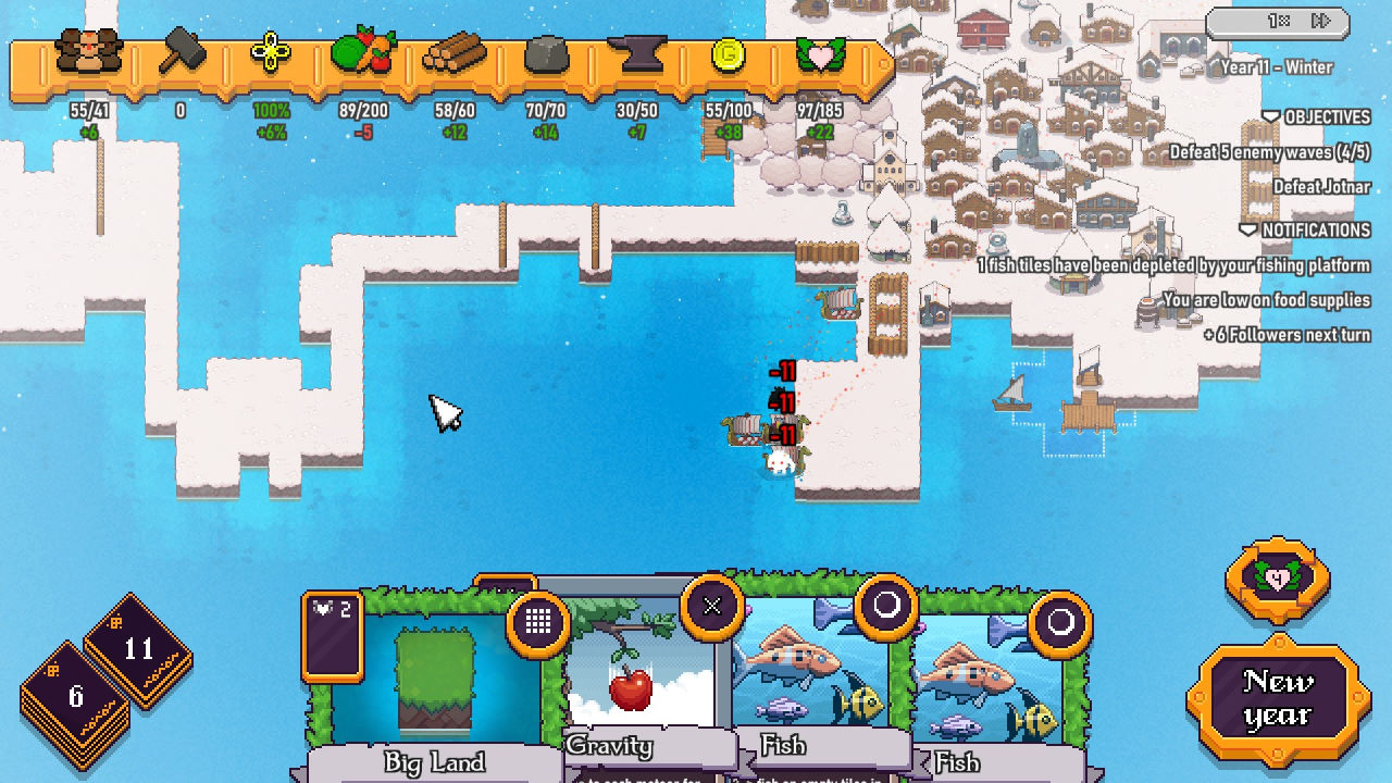 Ogni scenario ha determinati obiettivi che sono raggiungibili tramite l’espansione del nostro piccolo agglomerato di capanne: le carte che avremo nel mazzo ci permetteranno di costruire cave, capanni di pescatori, fattorie; ma anche di far miracolosamente apparire lembi di terra e foreste, passando per strutture difensive, torrioni con arceri e veri e propri soldati.