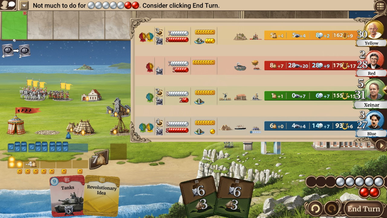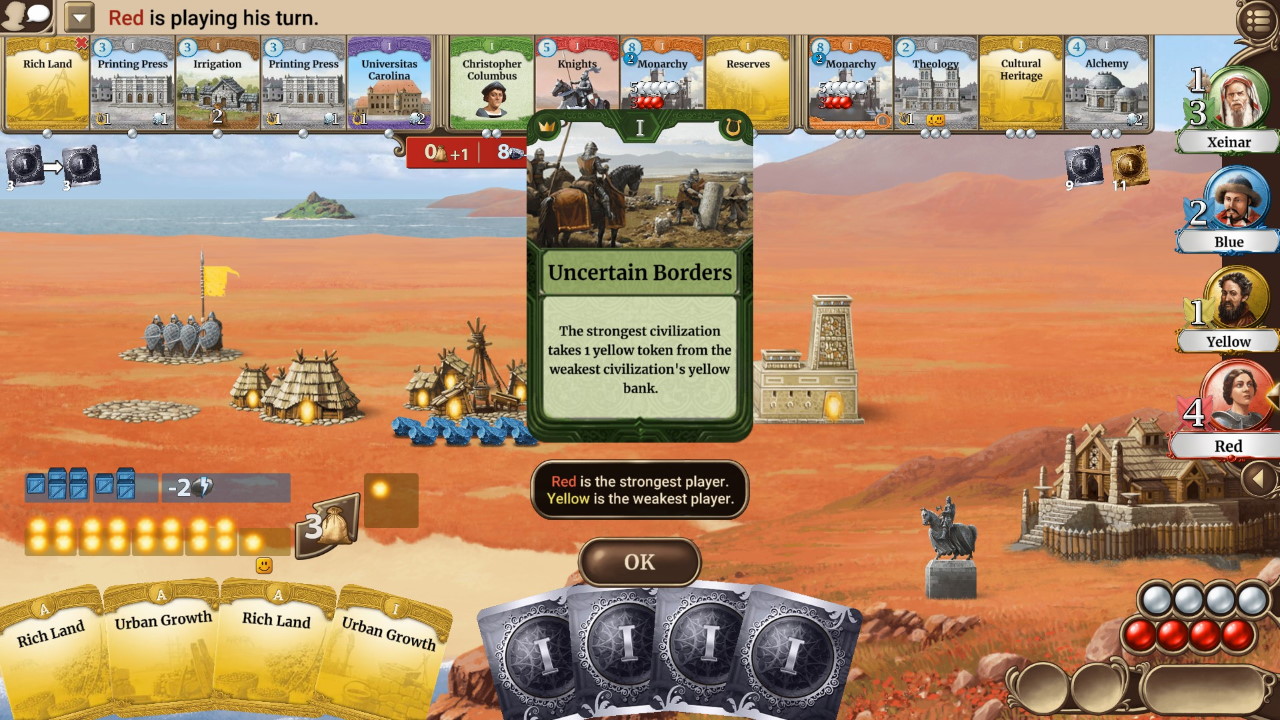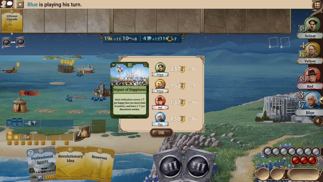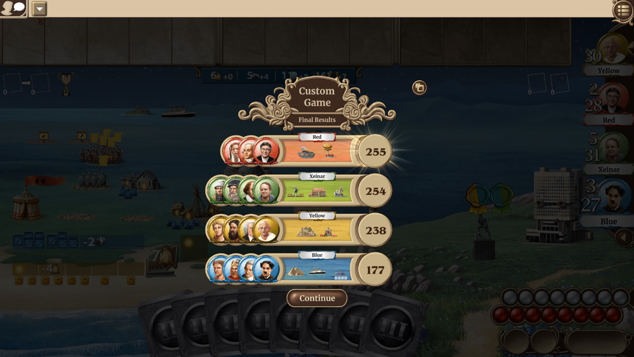 Il gioco, diviso in diverse epoche che vedono tecnologie sempre più potenti rendersi disponibili, utilizza un sistema di eventi globali a sancire il passaggio del tempo. Sul finire della partita – tramite edifici specifici ottenuti grazie alla rivalutazione delle altre componenti del gioco (il numero di cittadini felici, o la capacità scientifica tanto per dirne un paio) – anche chi avrà accumulato meno cultura potrà rimettersi in gioco.