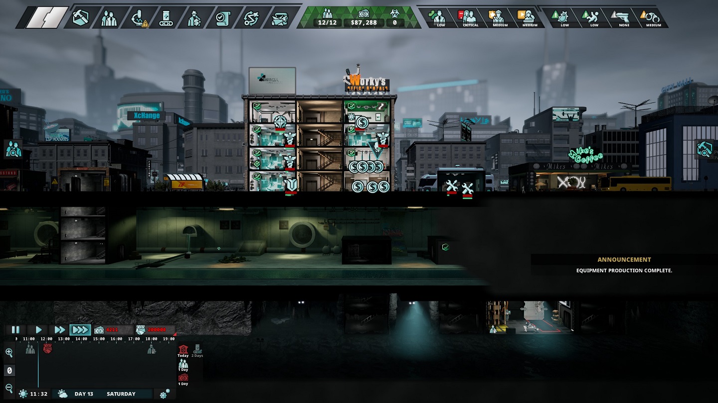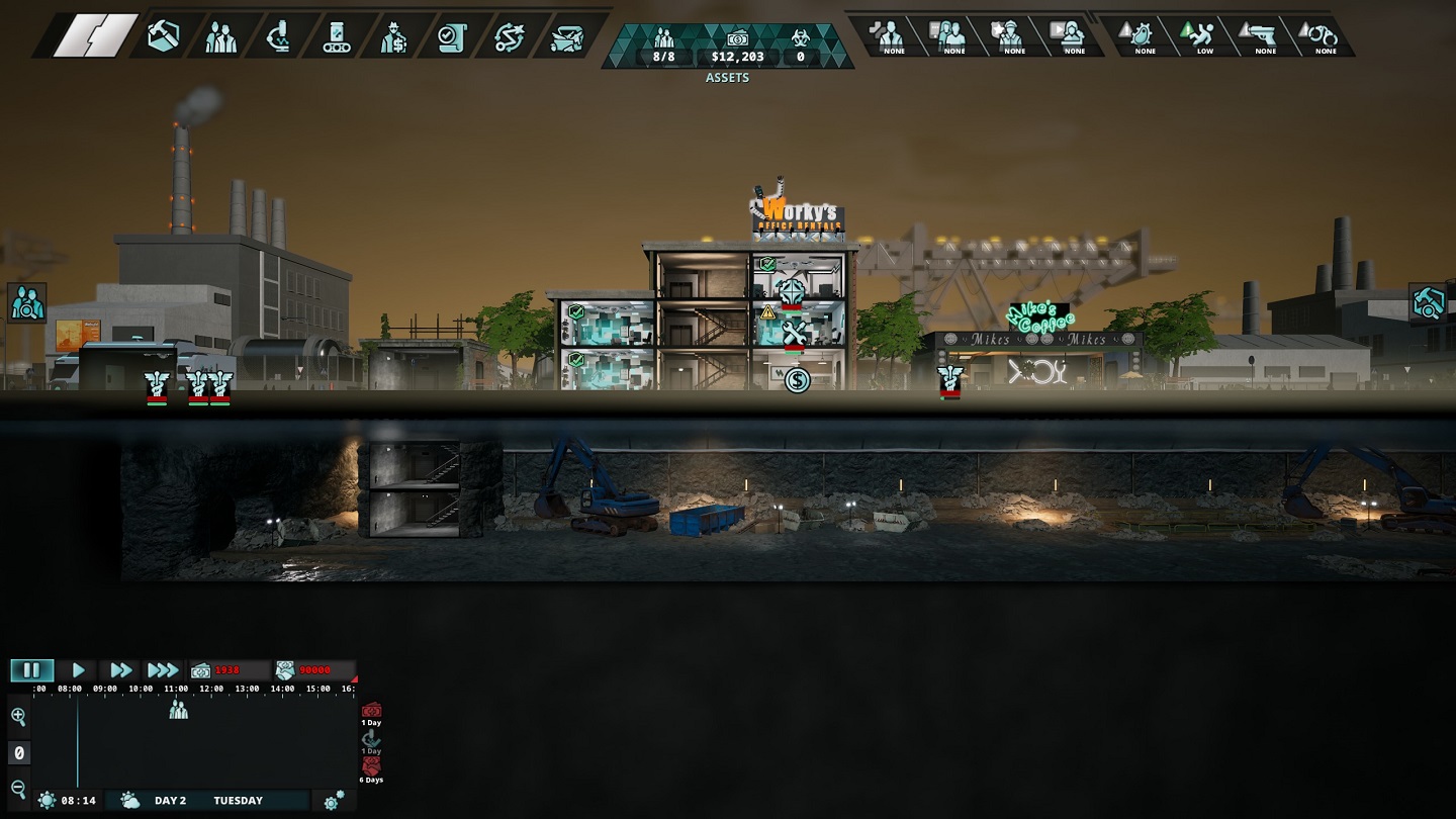 I soli studi medici non bastano a mantenerci in sella alla filiale, ed entra quindi in gioco l’aspetto più oscuro dell’azienda, ovvero l’accesso alla ricerca sperimentale e al mercato nero. Dobbiamo aprire dei laboratori di ricerca e assumere ricercatori per sviluppare armi e farmaci sperimentali. E poi la produzione e lo stoccaggio: stanze che richiedono altro personale, quindi l’affitto e la spesa per gli stipendi si alzano. Qui si aggiungono altri parametri da tenere d’occhio come gli indici di notorietà del pubblico, della polizia e dei media, ma anche il livello di sospetto dei nostri dipendenti. Se troppo elevati finiremo per avere effetti negativi come cali nelle vendite, raid della polizia o dimissioni del personale. Se abbiamo fatto tutto bene, gli introiti dovrebbero bastarci per coprire una seconda tassa e addirittura anche la terza. Qualora la riunione aziendale si avvicinasse e non dovessimo avere i soldi per pagare la tassa possiamo chiedere un prestito per coprire la mancanza oppure estrarre, ovvero scappare in una nuova sede portando dietro con noi quattro impiegati e tre elementi a scelta tra ricerche, soldi o bio-materiale; utili per un inizio rapido nella nuova sede. Completare con successo tre estrazioni significa vincere lo scenario.