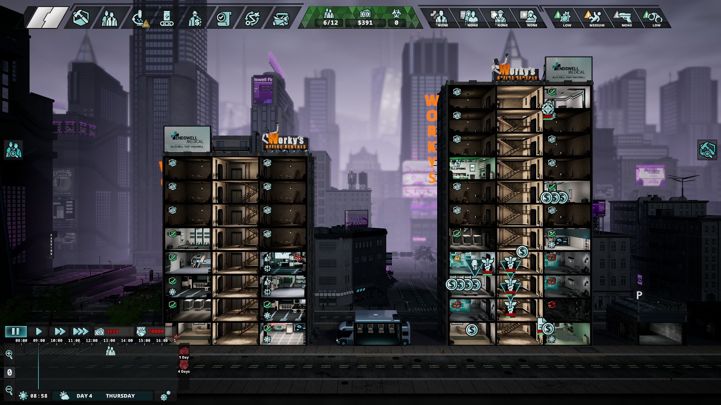Il gioco si apre con un’interfaccia che richiama i colori dell’azienda per cui lavoriamo e ci offre due modalità di gioco: la carriera, una modalità di gioco con ambienti generati proceduralmente e che offre dei potenziamenti come ricompensa, oppure la modalità a scenari, con delle situazioni già predeterminate. A prescindere dalla scelta, dovremo prendere i panni di un direttore, la persona più importante all’interno dello staff, selezionare alcune abilità e prendere posto nell’ufficio. La nostra filiale si sviluppa su un intero quartiere e nei livelli sotto la strada, quindi dobbiamo tenere in considerazione che non sarà facile gestirla come fosse un’unica sede. Come parte di un franchise a marchio Endswell, periodicamente dovremo pagare all’azienda madre una tassa, ed è proprio quello il nostro scopo: pagarne almeno una. Solo dopo aver pagato una o più tasse di franchise avremo infatti la possibilità di estrarre, ovvero abbandonare l’edificio per spostarci in una nuova zona.