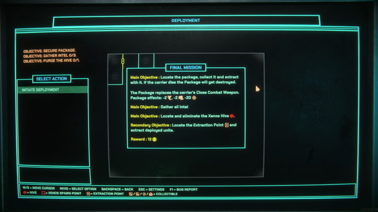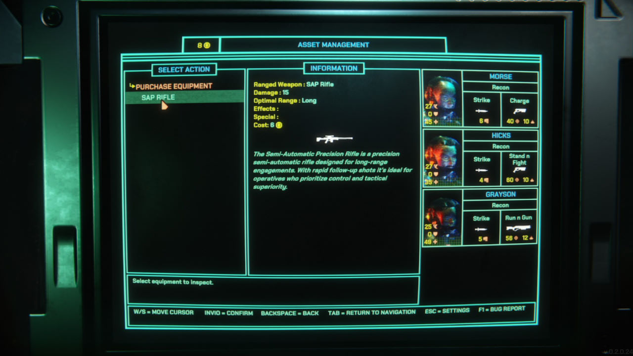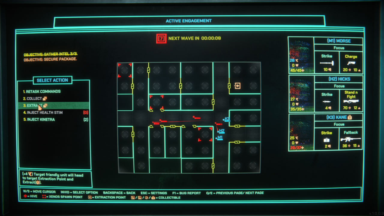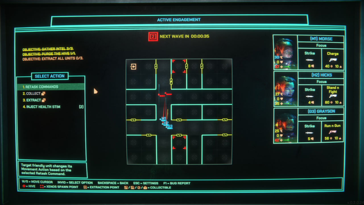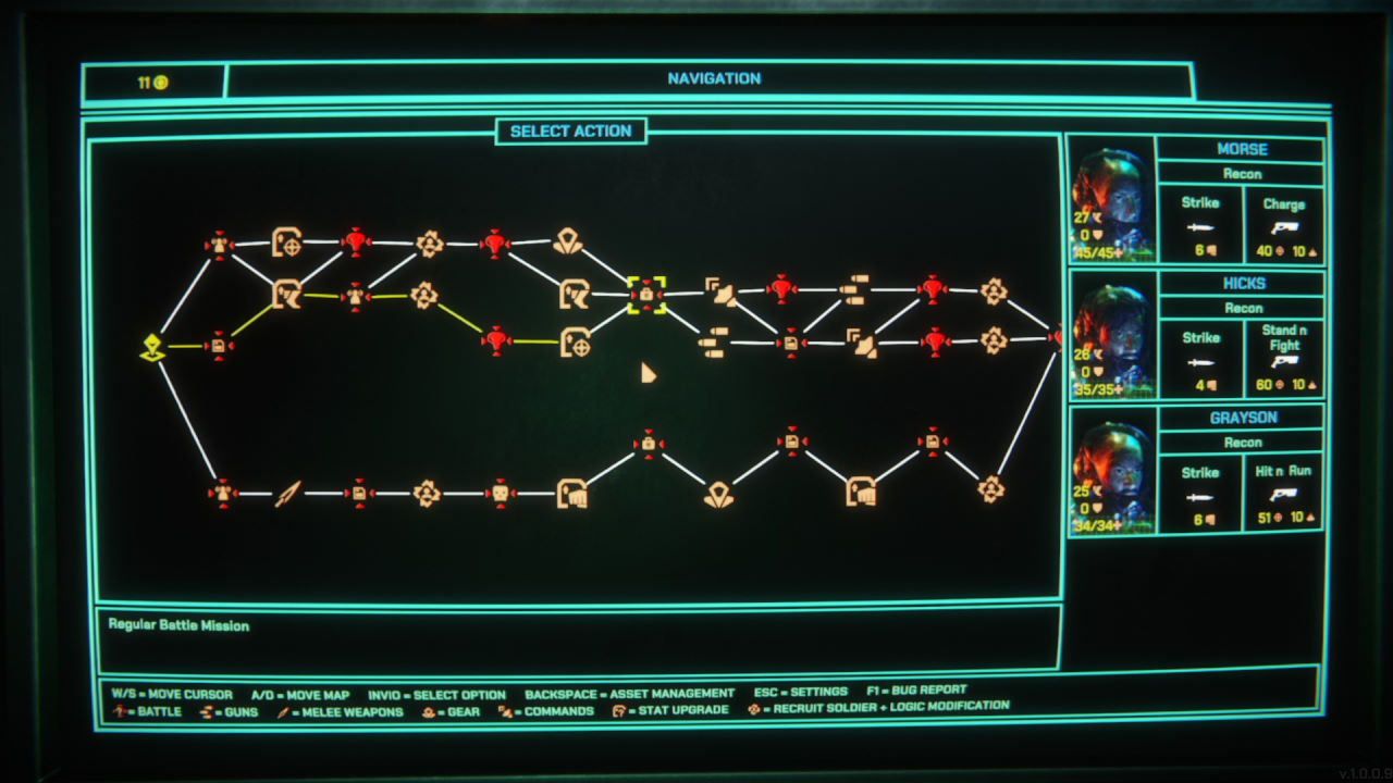Il secondo aspetto da menzionare è il fatto che per dare istruzioni ai nostri soldati (che non sono sveglissimi, diciamolo) dobbiamo impartire ordini ben precisi; tanto precisi che il più usato, il generico “Recon”, ordina di andare in giro per la mappa a casaccio in cerca di punti di interesse. Possiamo dare istruzioni a singoli soldati di seguire qualcuno, di raccogliere oggetti, o più avanti (una volta sbloccato l’ordine secondo i criteri della progressione tipica dei roguelite) di entrare in una particolare stanza o di restare sul posto a fornire copertura.